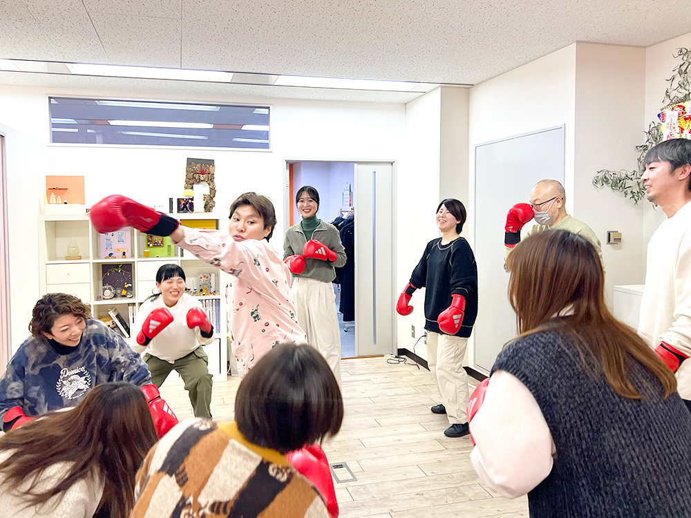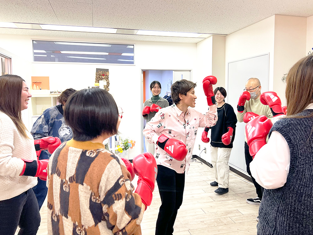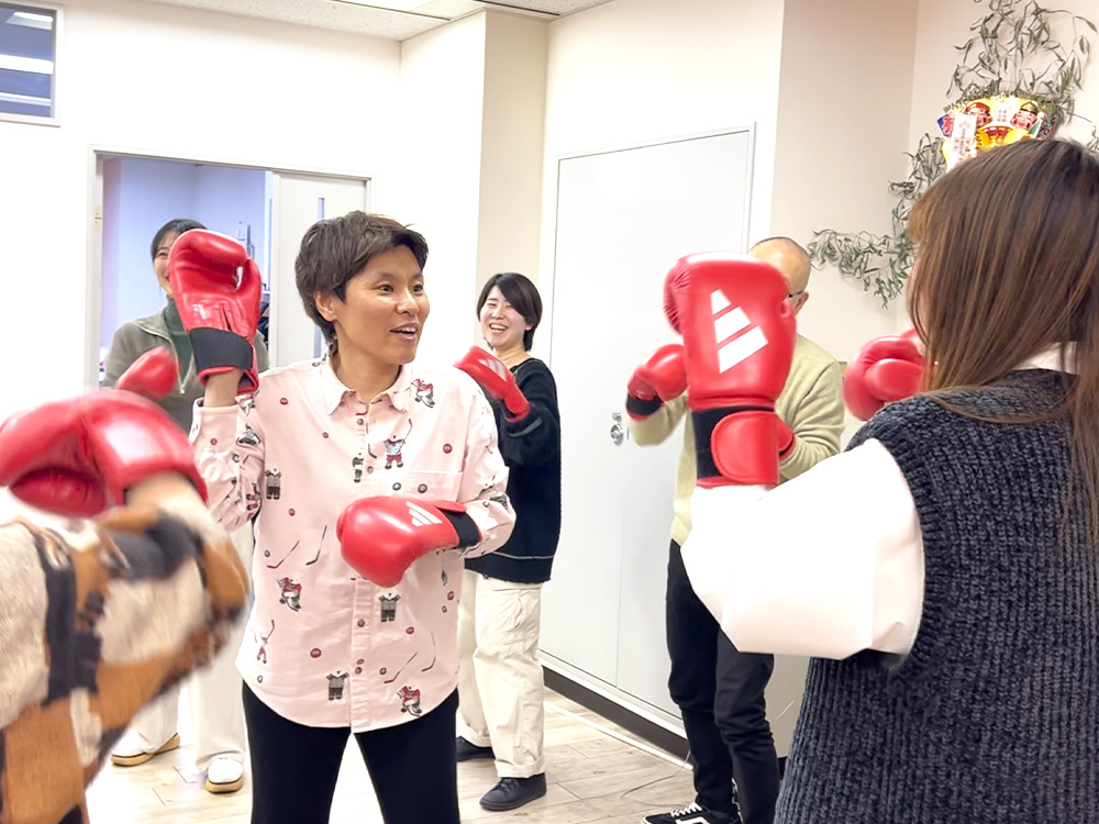 この取り組みの一環として、アスリート経験を持つ講師がオフィスを訪問し心と体の向き合い方をレクチャーする研修が「アスリート式」。講義だけではなく、社内のスペースを使ってボクシング体験や体を動かすことで得られる小さな変化を体感し、強くしなやかな心を養っていく内容です。