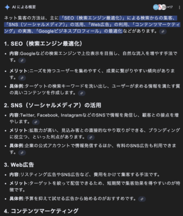 複数の情報源から情報をかき集めて、一つの包括的な回答として提示してくれるんです。