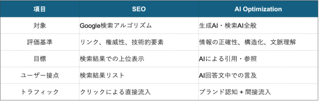 従来のSEOが「Googleの検索アルゴリズム向けの最適化」だったのに対し、AIOは「AI(大規模言語モデル : LLMs)向けの最適化」です。