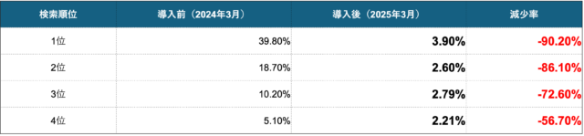 - 検索順位1位のクリック率(CTR)が39.8%から3.9%へ激減(約10分の1)