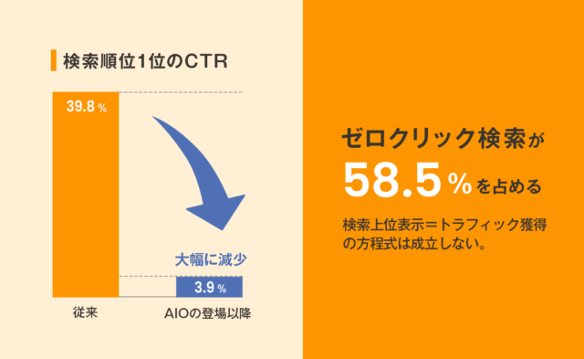 検索順位1位のCTR(クリック率)が39.8%から3.9%へと約10分の1に激減し、ゼロクリック検索が全体の58.5%を占める——この衝撃的な数字は、もはや「検索上位表示 = トラフィック獲得」という方程式が成立しない時代に突入したことを意味しています。