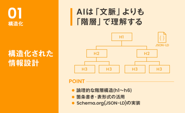 そのため、以下のような構造化された情報設計が不可欠です。