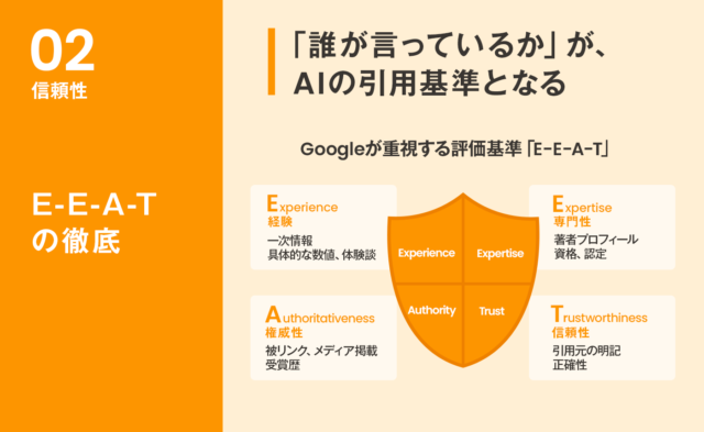 AI時代において、E-E-A-T(Experience, Expertise, Authoritativeness, Trustworthiness)の重要性はさらに高まっています。